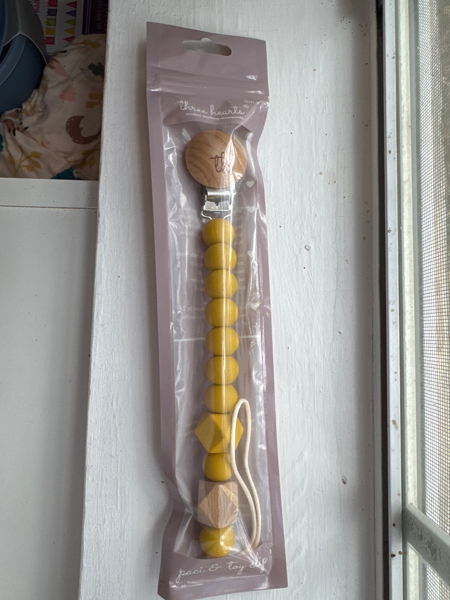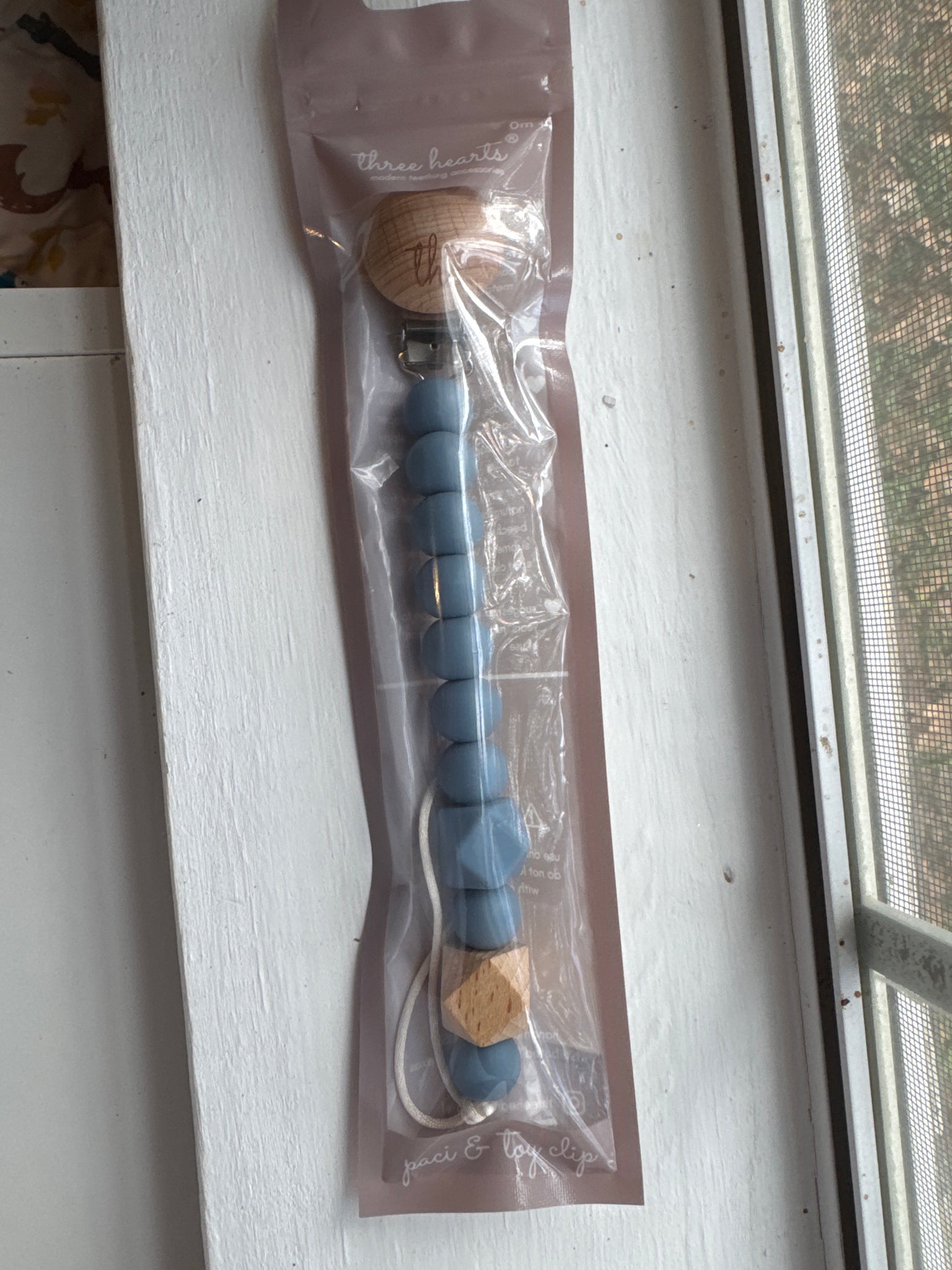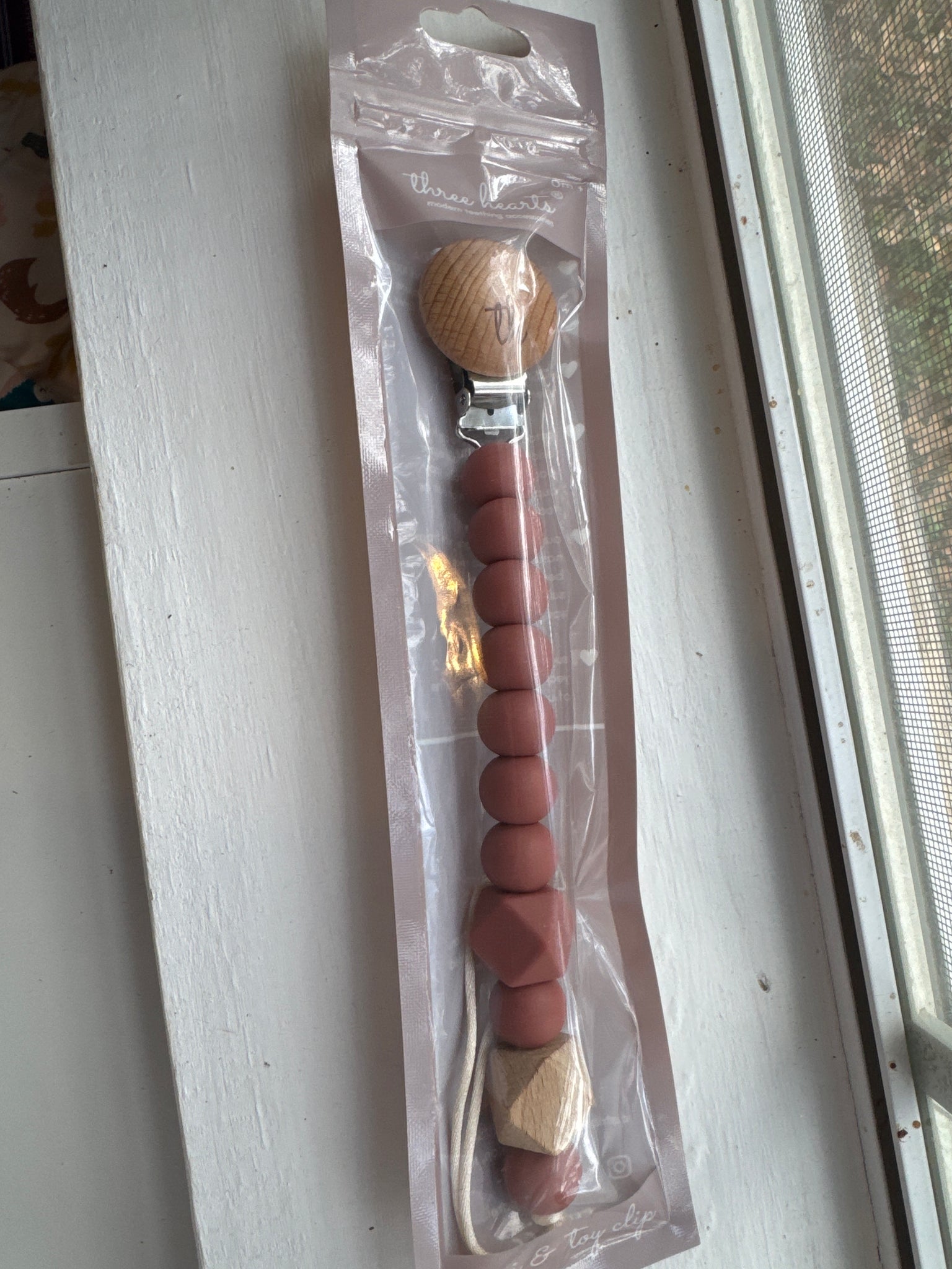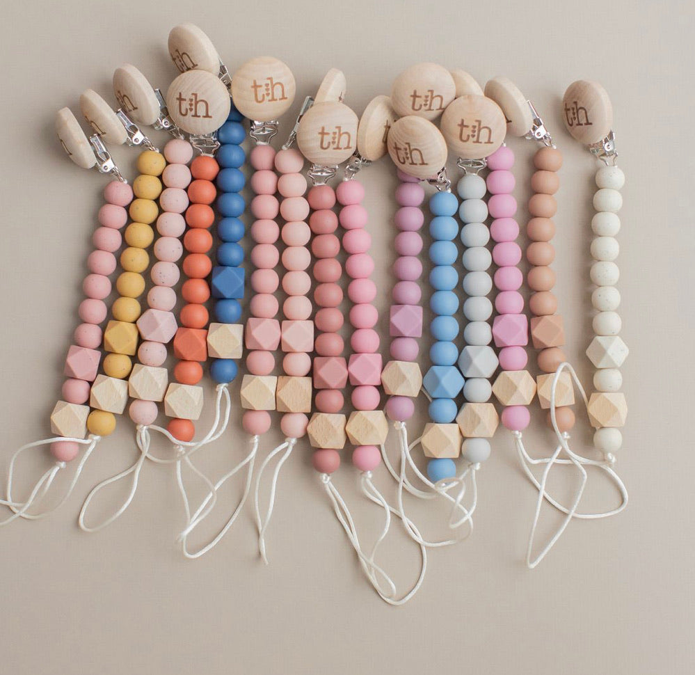 The Jolie Pacifier Clip - Food Grade Silicone can be worn by both baby and Mom! The front of the clip is a circle made of beech wood and has the Three Hearts logo engraved into it. A strand of ten, circular non-toxic silicone beads gracefully dangle down below. One added beech wood bead sits at the bottom for a pop of style and a difference in texture for baby. With every color of the rainbow and some in between, the Jolie Pacifier Clip - Food Grade Silicone is sure to please any fashion. Give a baby shower gift in style that will last a lifetime.